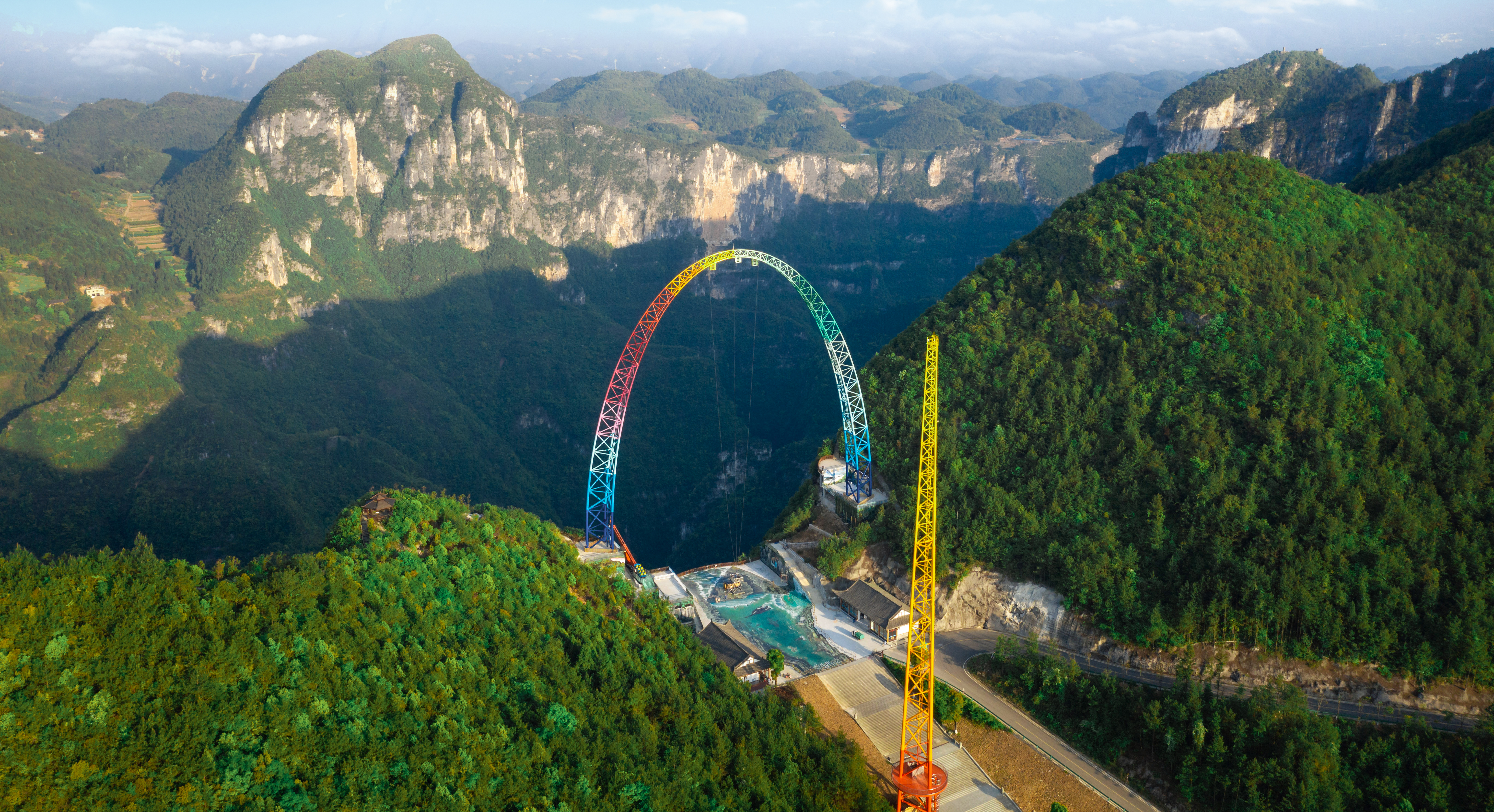 由中冶設(shè)備院自主研發(fā)、設(shè)計、制造、安裝的云端彩虹秋千,坐落于重慶龍缸5A景區(qū)700米的懸崖邊緣,主體由高100米、基礎(chǔ)跨距87.6米的彩虹涂裝拱形塔和高108米的提升發(fā)射塔等部分組成,該設(shè)備最大提升高度88m,最大運行速度可達130km/h,以“世界最高的框架秋千”稱號被載入吉尼斯世界紀(jì)錄。